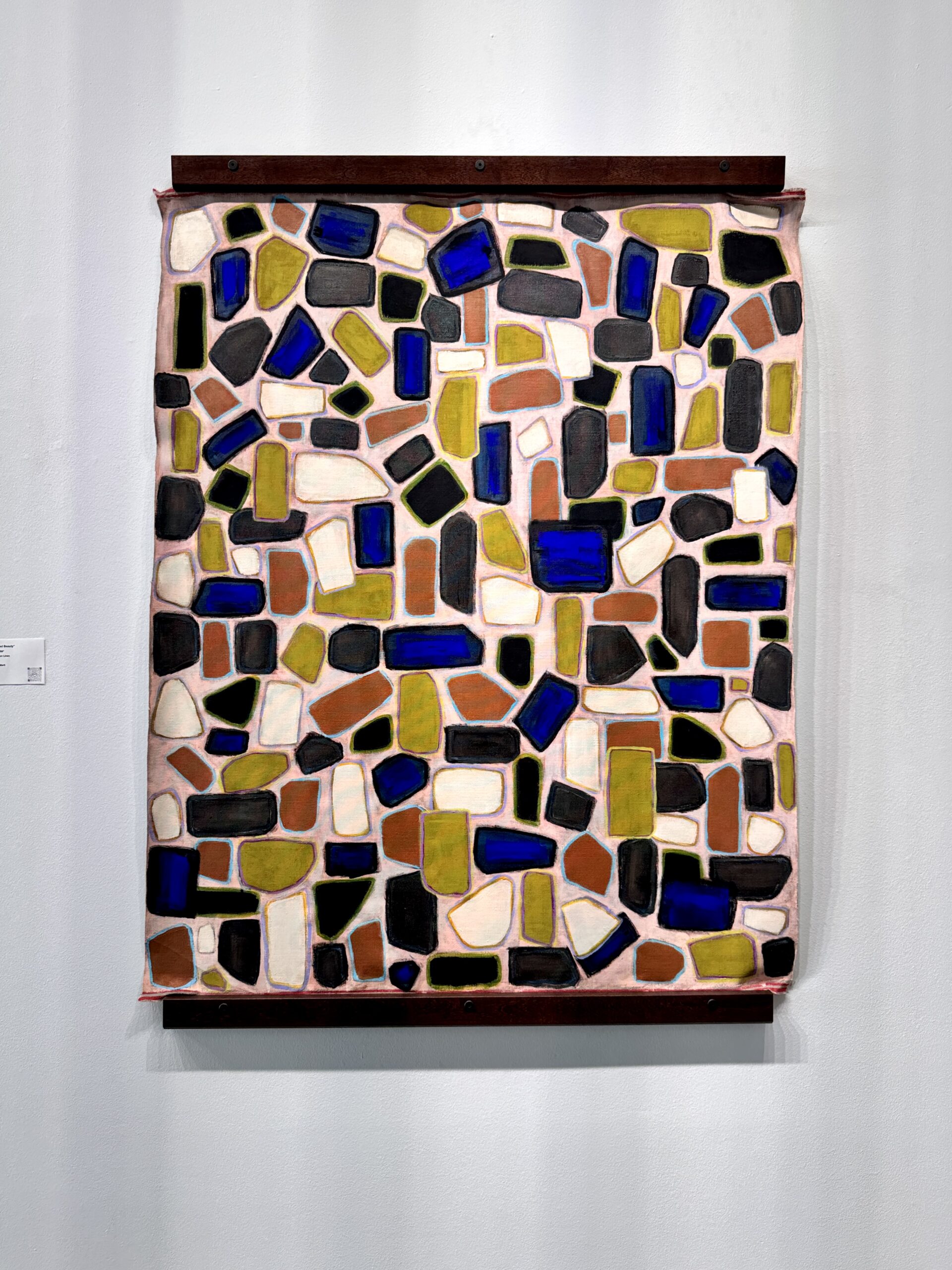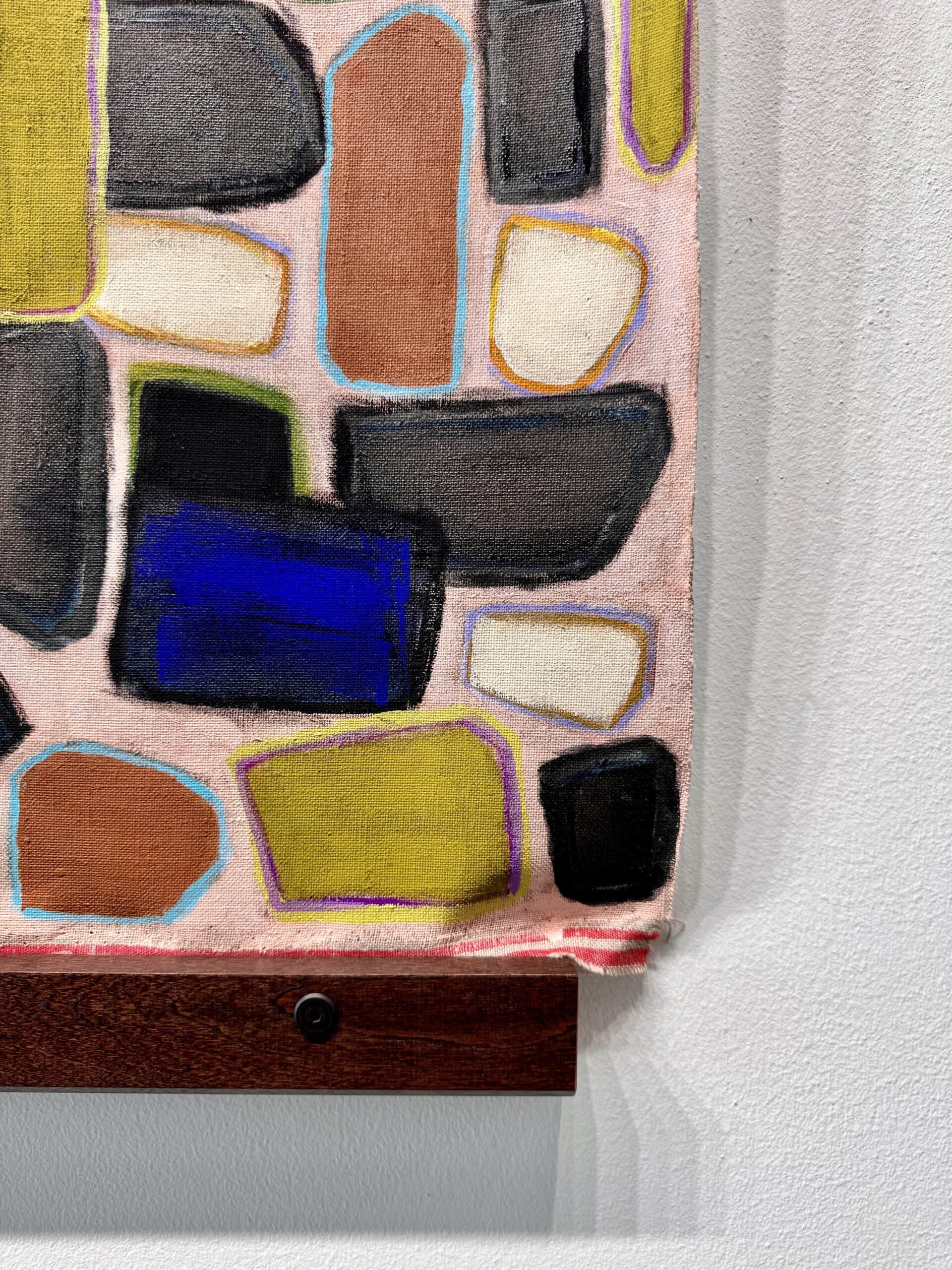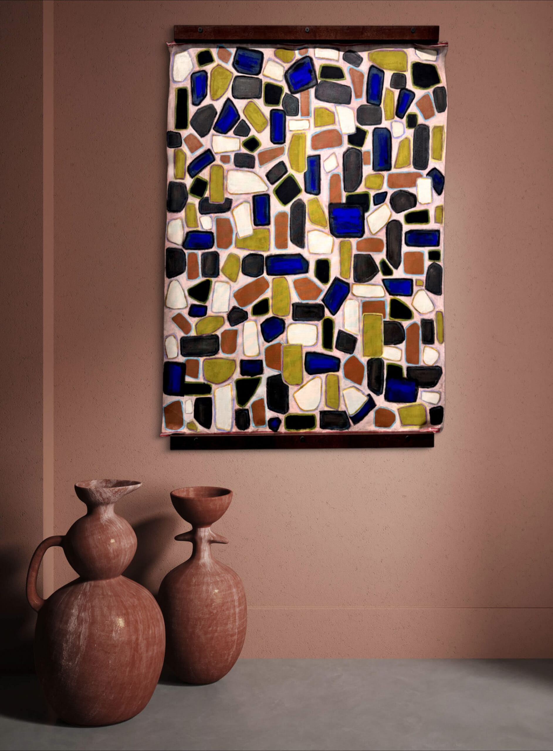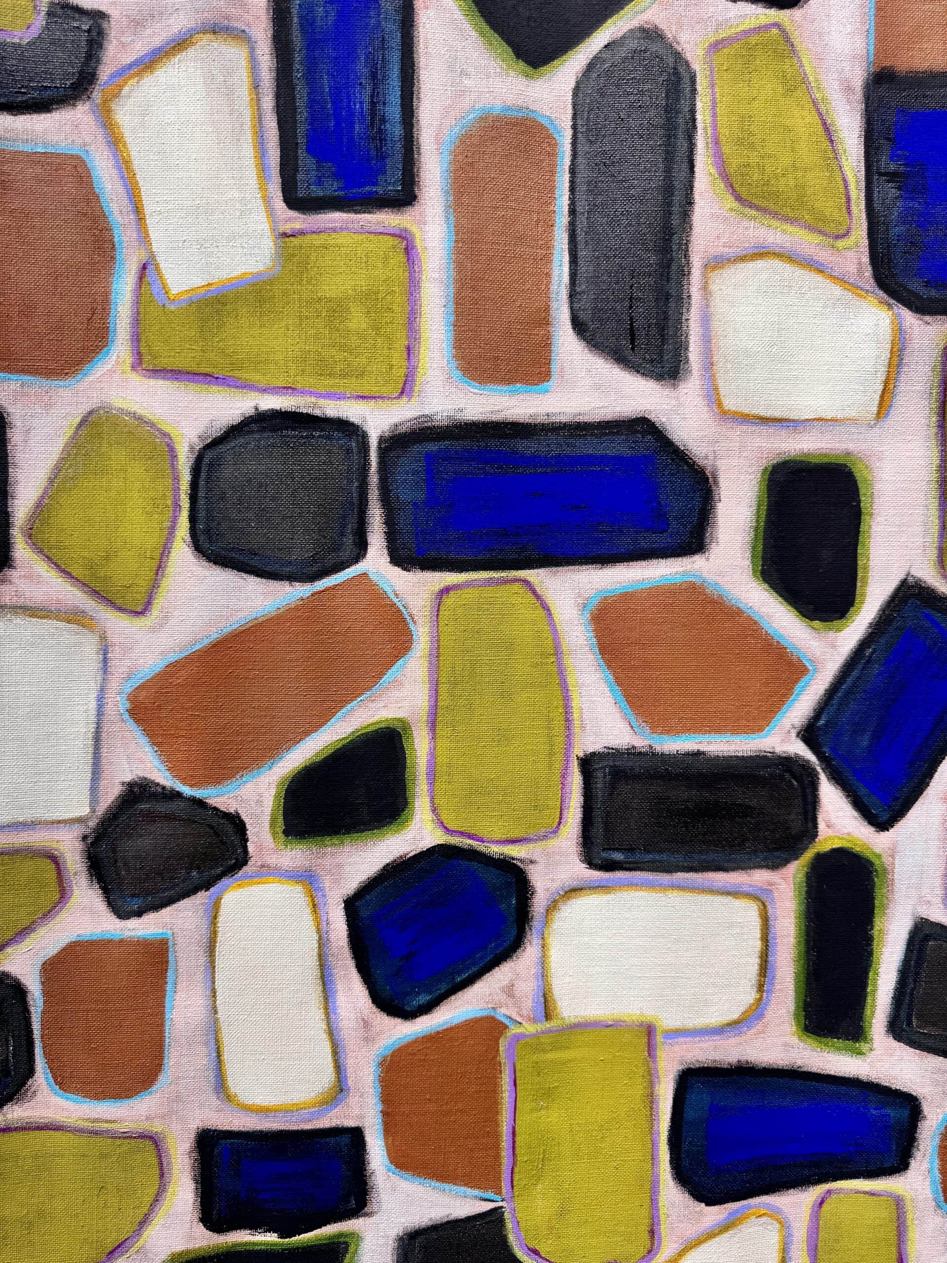 Rugged Beauty presents a captivating contemporary interpretation of mosaic-inspired abstraction, where organic pebble-like forms create a dynamic tapestry of color and movement. This large-scale original artwork transforms the ancient art of stone and ceramic tessellation into a bold, modern painted statement that bridges geological inspiration with contemporary artistic vision.