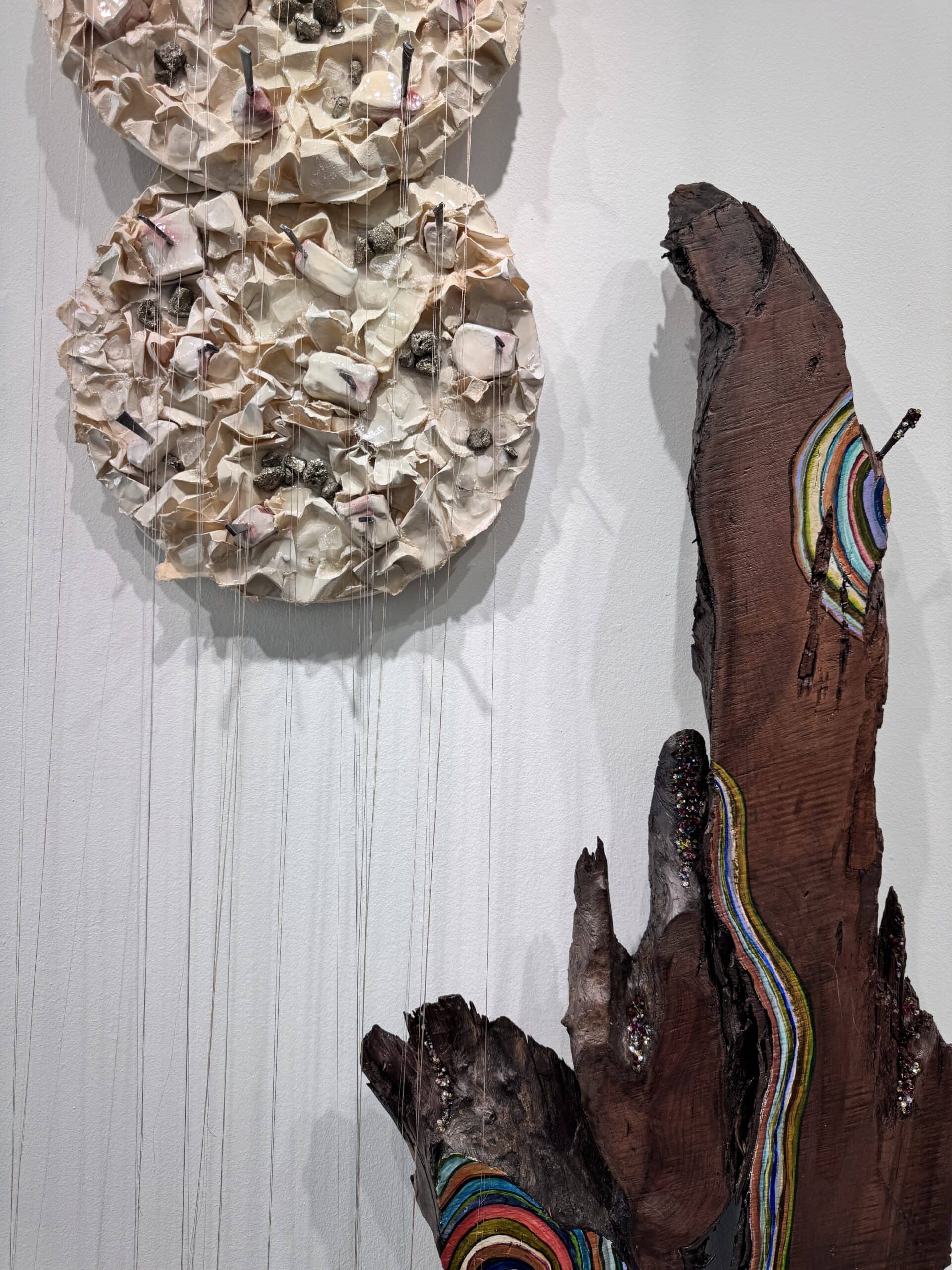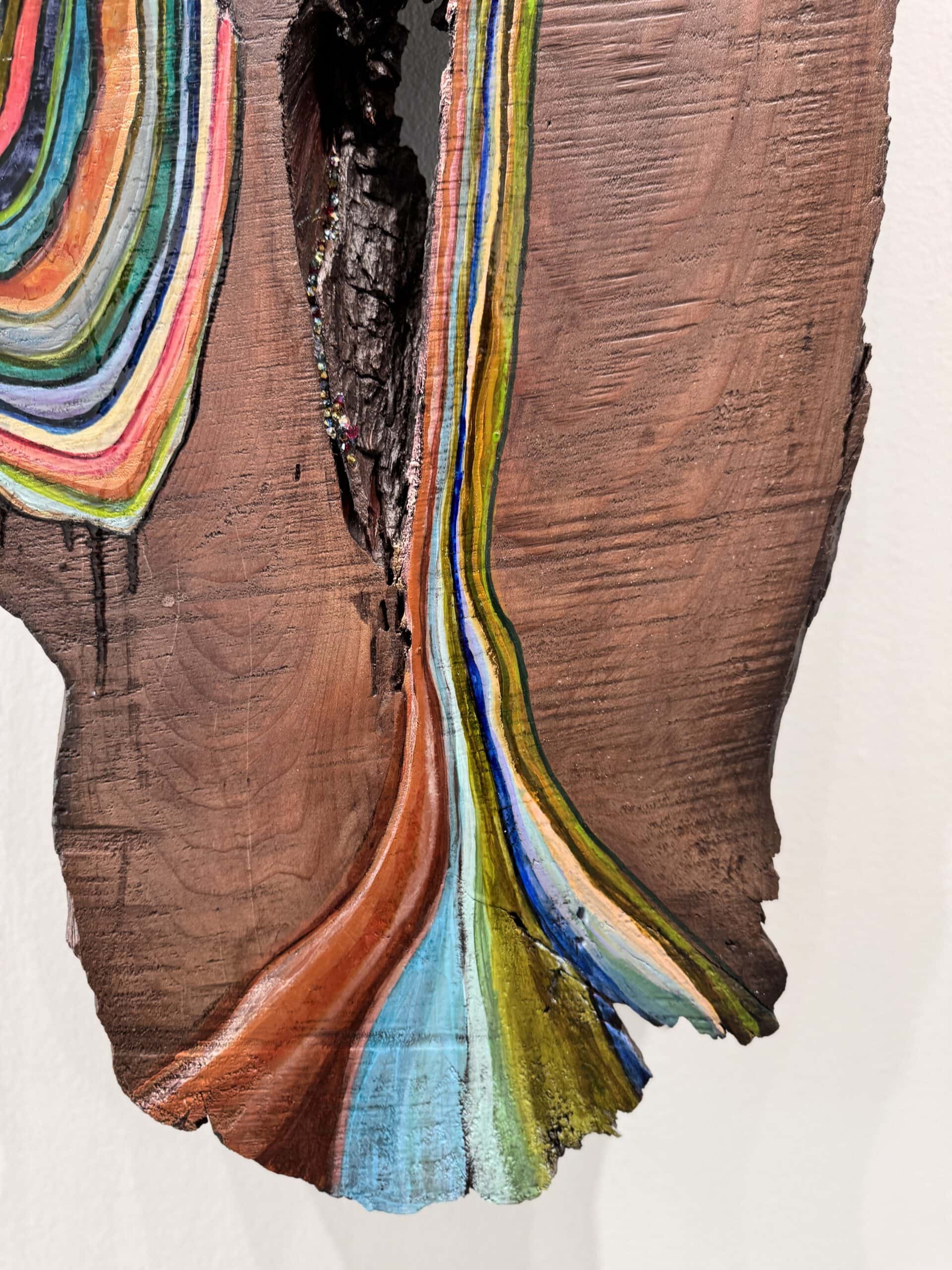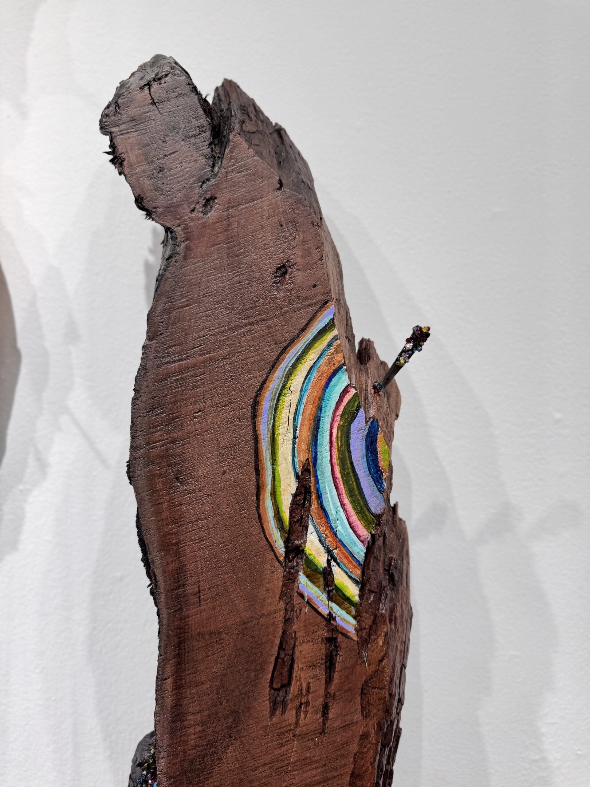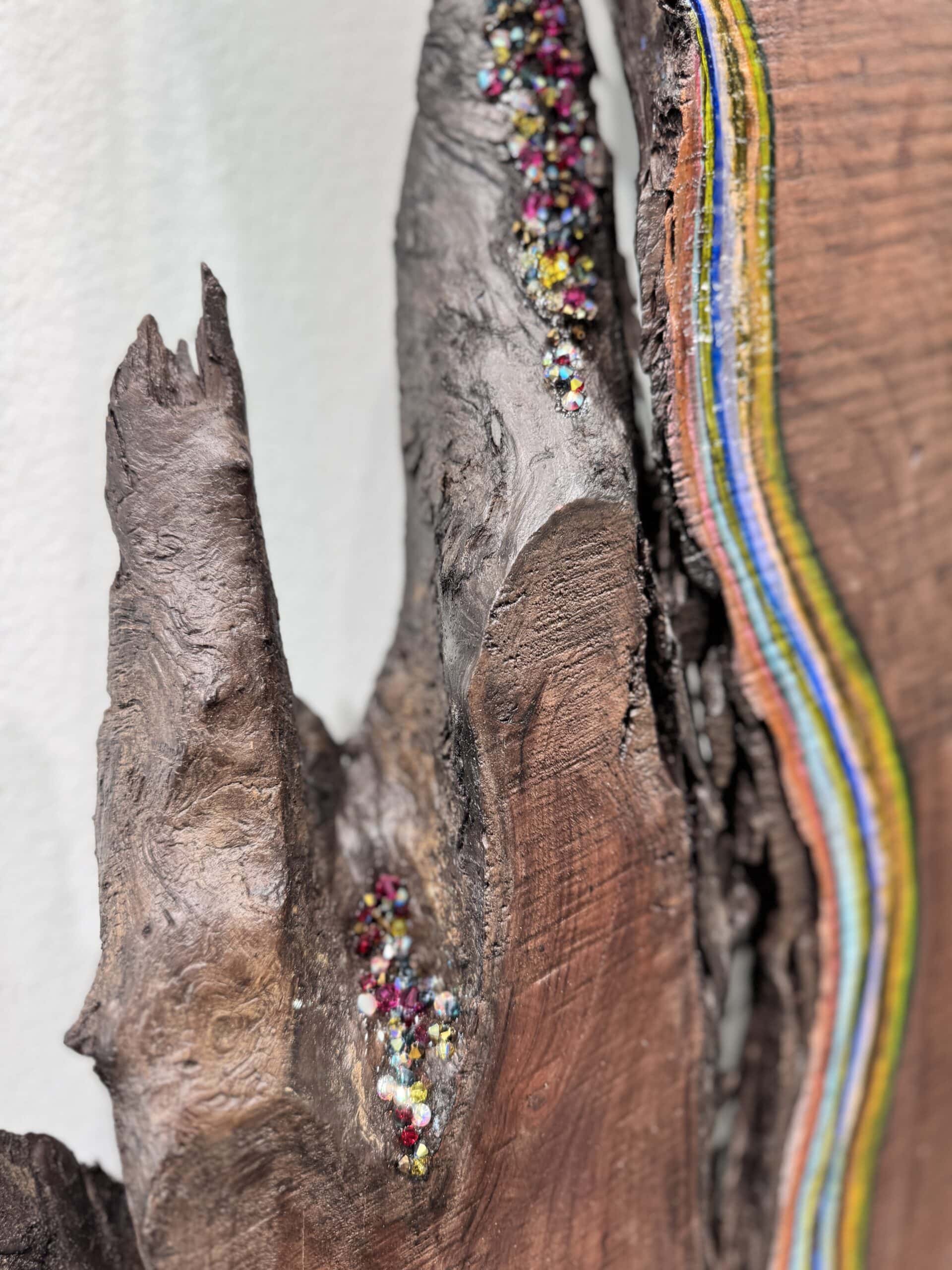 Created with acrylic paint, Swarovski crystals, resin, mulberry paper, clay, nails, and thread on sustainably sourced old-growth redwood, this unique piece captures the ethereal quality of moonlight filtering through natural landscapes. The painted bands follow the wood’s inherent fractures, suggesting geological strata or aurora-like phenomena, while strategically placed Swarovski crystals add points of brilliant light that shift and sparkle with ambient illumination. Delicate mulberry paper elements and suspended threads create additional layers of texture and movement, enhancing the work’s multidimensional presence.