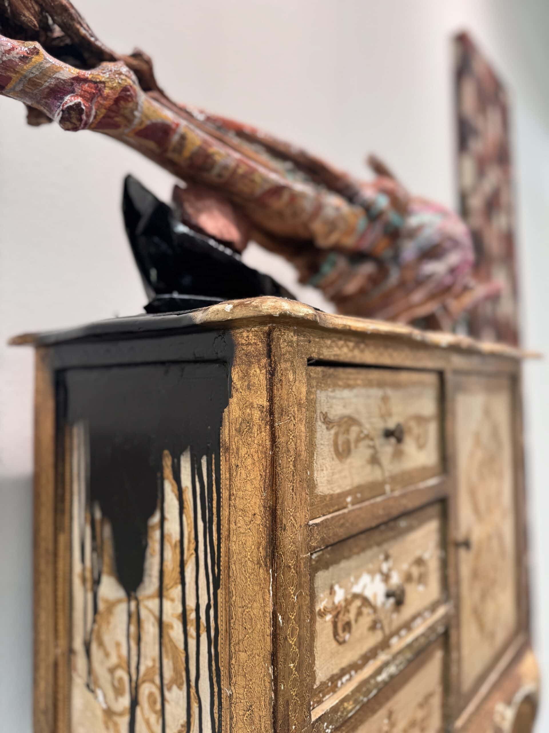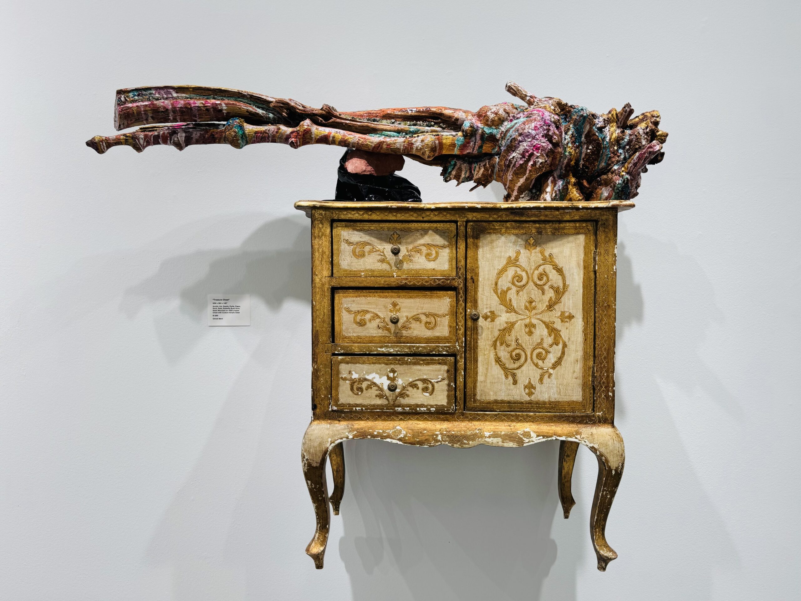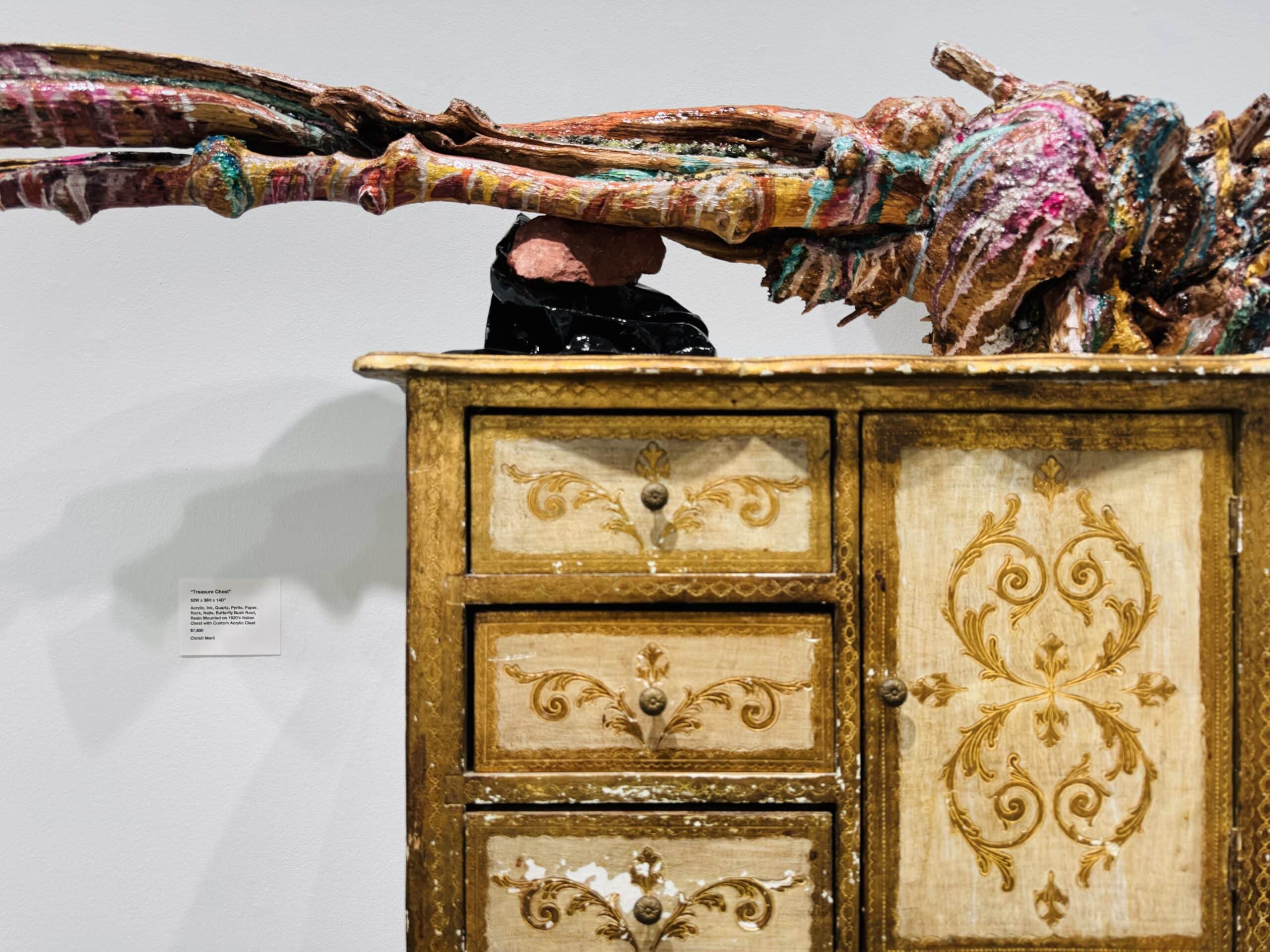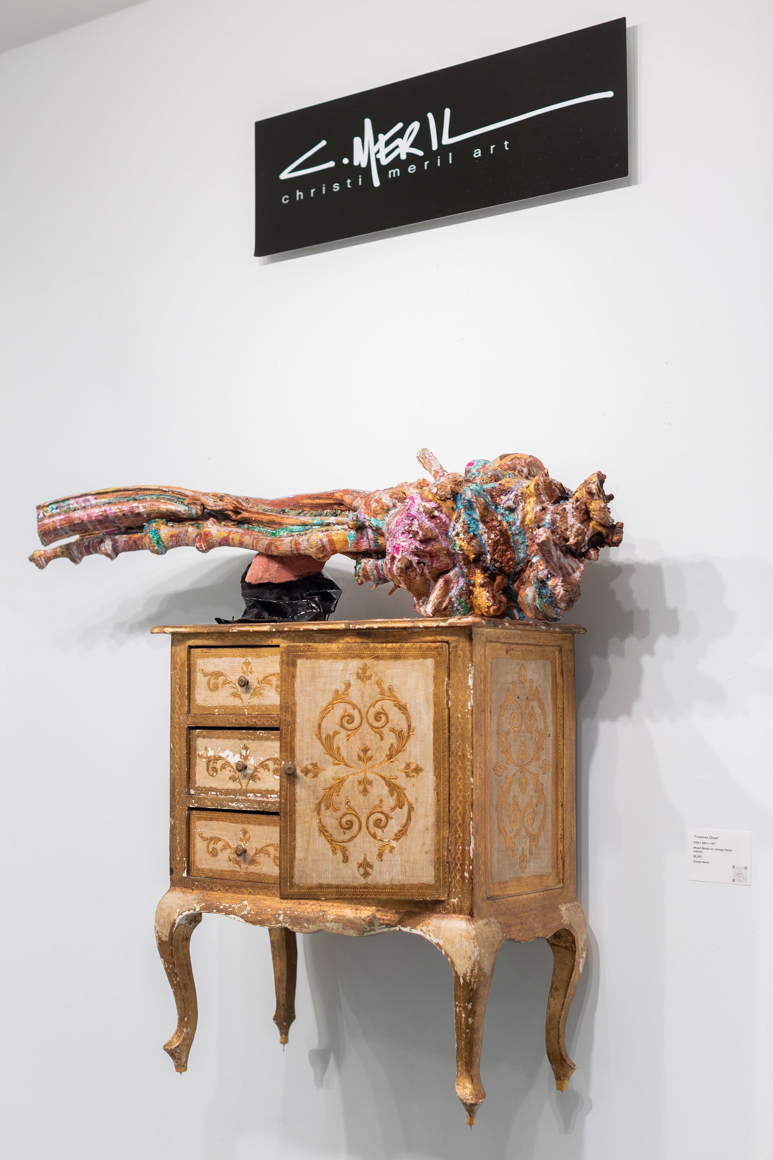 The sculpture’s foundation is an elegant Italian cabinet from the 1920s, its aged wood and refined proportions speaking to an era of exceptional craftsmanship. The cabinet’s warm patina and detailed hardware provide a sophisticated backdrop for Christi’s contemporary intervention, creating a dialogue between European decorative arts tradition and American environmental art expression.