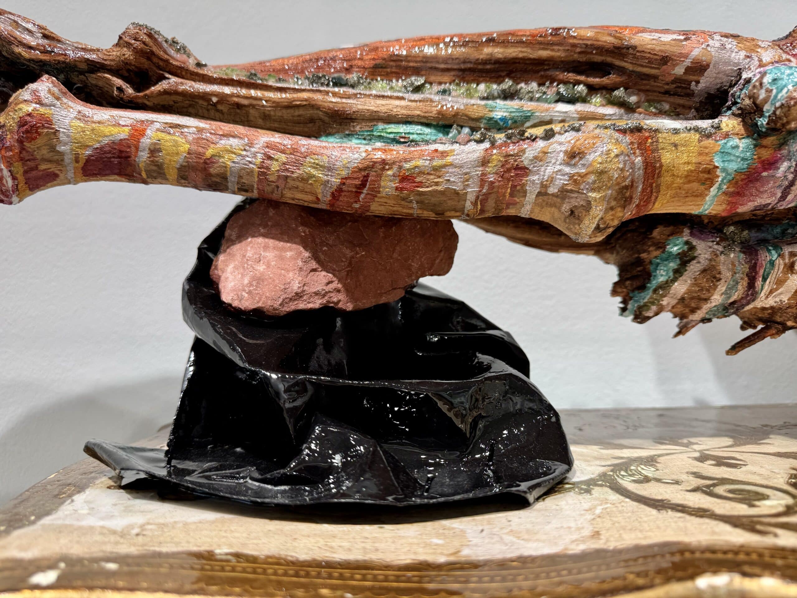 Across the cabinet’s surface, a dynamic landscape unfolds through mixed media elements that blur the boundaries between sculpture and painting. A Colorado campfire stone anchors the composition, its fire-weathered surface carrying the memory of countless mountain evenings and the elemental power of flame meeting stone. This geological artifact serves as both sculptural element and spiritual talisman, representing the artist’s deep connection to Colorado’s high country landscapes.