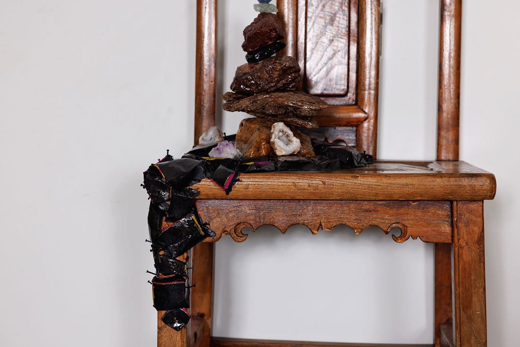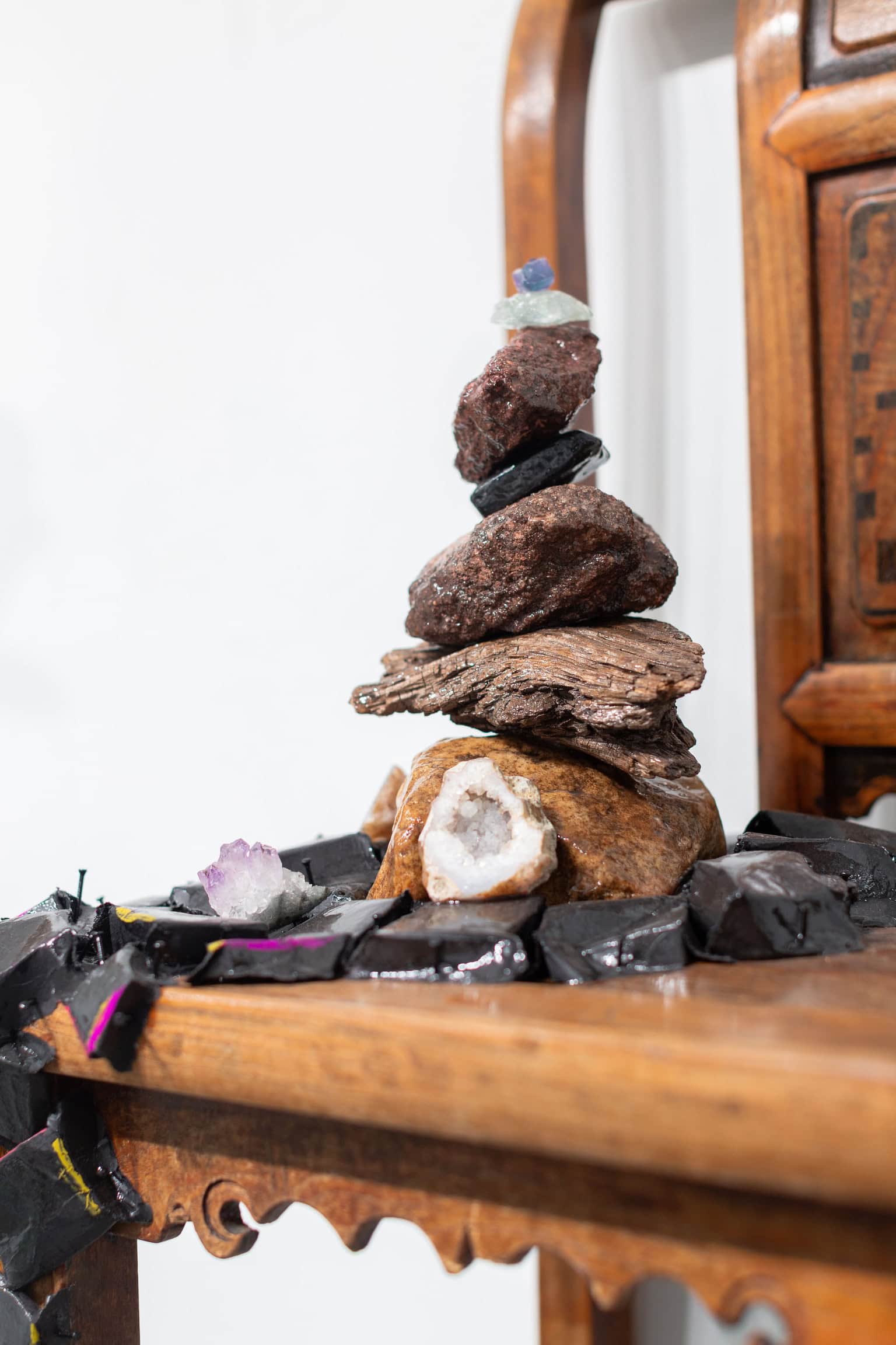 Upon the chair’s seat, Christi has created a delicate cairn from carefully selected natural stones and pieces of weathered driftwood, each element chosen for its unique character and contribution to the overall balance. The stones, gathered from various landscapes during the artist’s nature immersions, represent the geological timespan that dwarfs human history yet connects us to the earth’s deepest rhythms. The driftwood pieces, shaped by water and time, add organic curves that soften the stones’ angular geometry while introducing the element of water’s patient sculpting power.