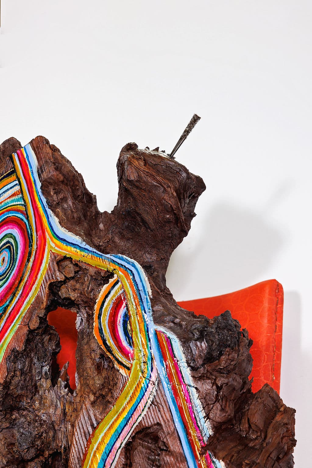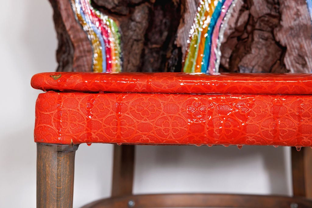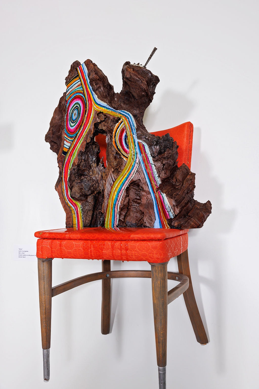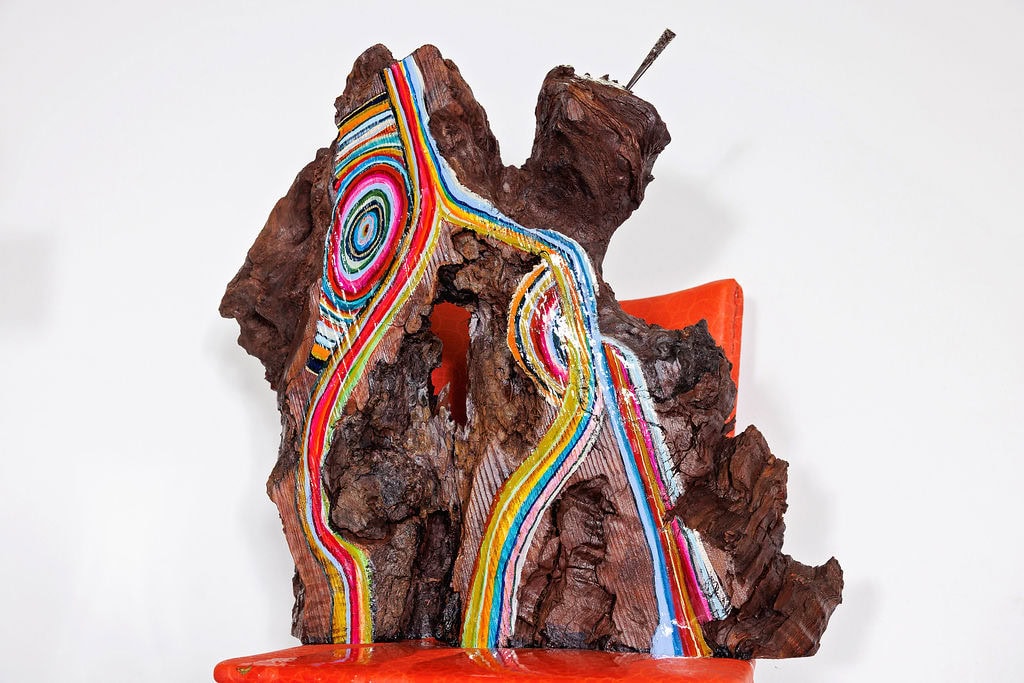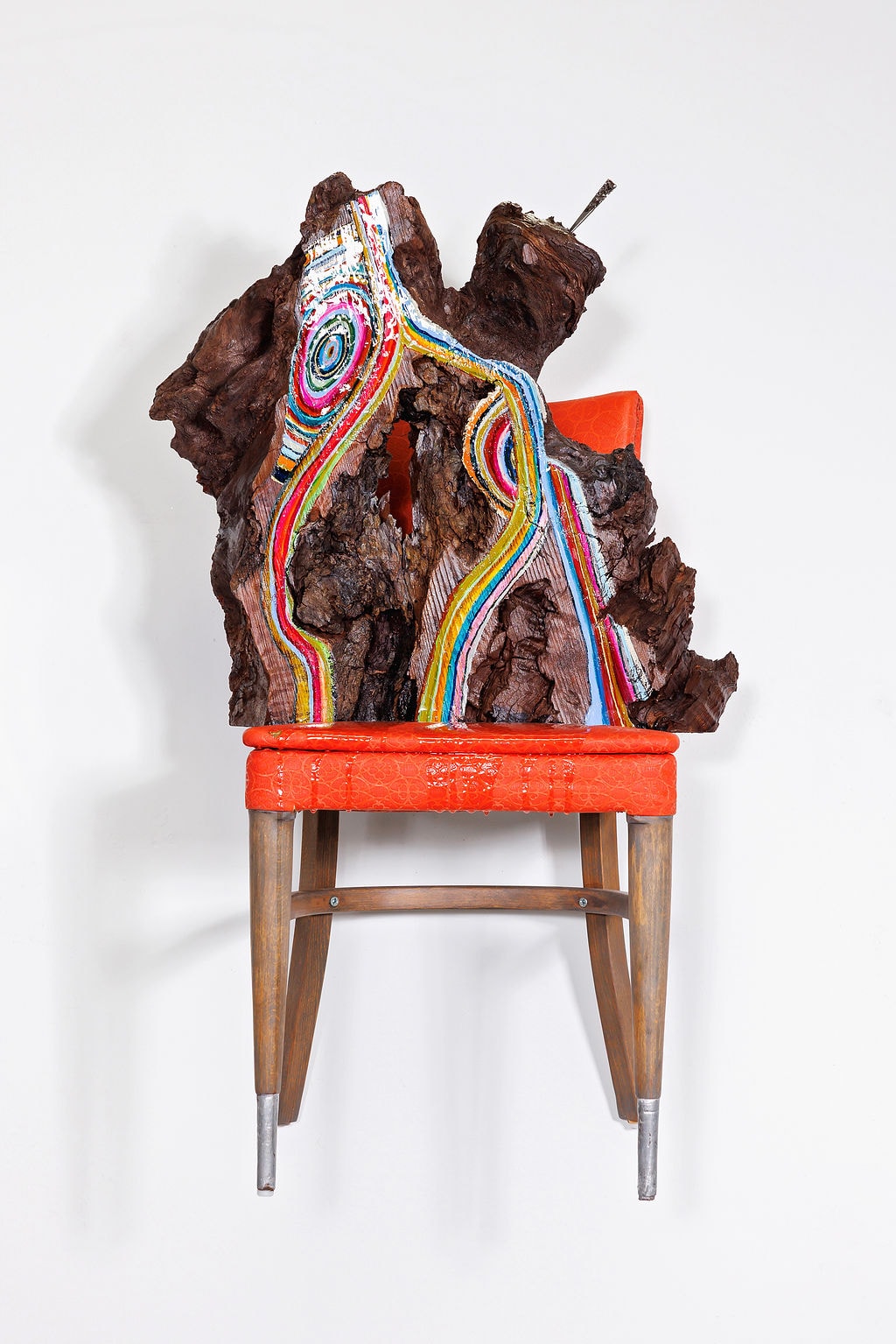 The sculpture’s foundation is an iconic orange vinyl chair from the 1960s, its bold color and sleek lines embodying the era’s optimistic embrace of synthetic materials and modern design. The chair’s vibrant orange surface, with its characteristic vinyl texture and mid-century proportions, provides a striking contrast to the organic complexity of the redwood while anchoring the piece in a specific moment of American design history. This was an era of space-age aesthetics and unprecedented prosperity, when plastic and vinyl represented the future’s unlimited possibilities.