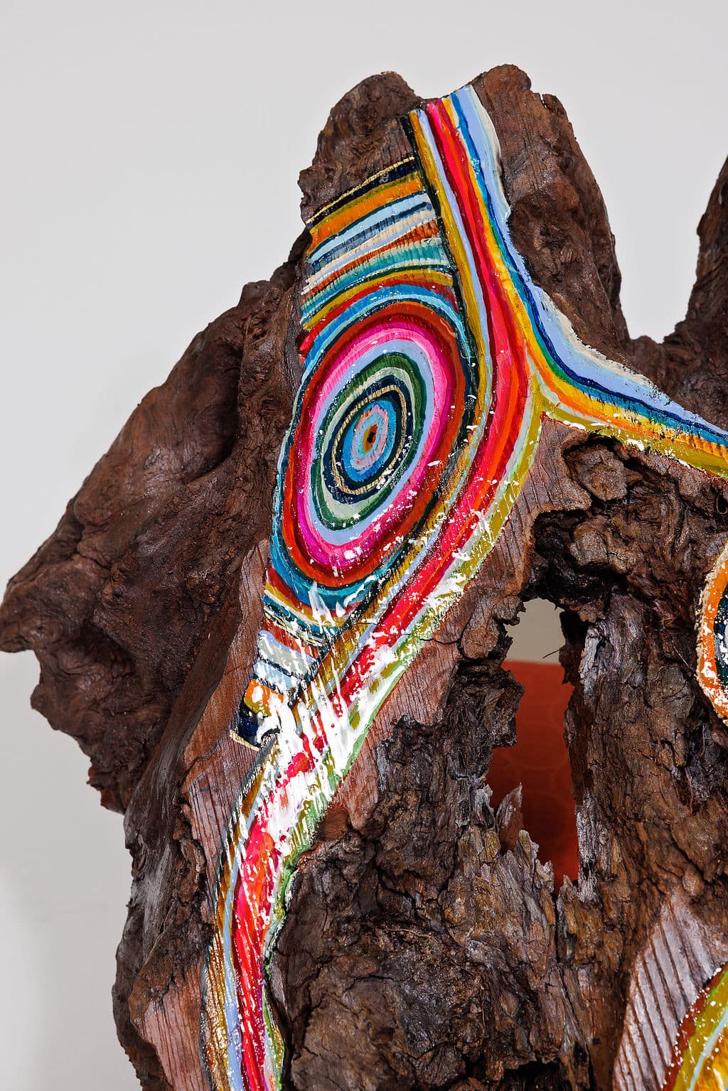 The redwood section reveals the spectacular natural artistry that develops over centuries of growth, intricate grain patterns, rich reddish-brown coloration, and the distinctive texture that made these trees both revered and coveted. Christi has enhanced this natural beauty with carefully applied paint that follows and accentuates the wood’s organic patterns, creating flowing streams of color that echo the geological stratifications found in her signature cairn and stone works. The painted elements don’t mask the wood’s character but rather illuminate its inherent sculptural qualities, suggesting the way water, light, and time create patterns in both stone and timber.