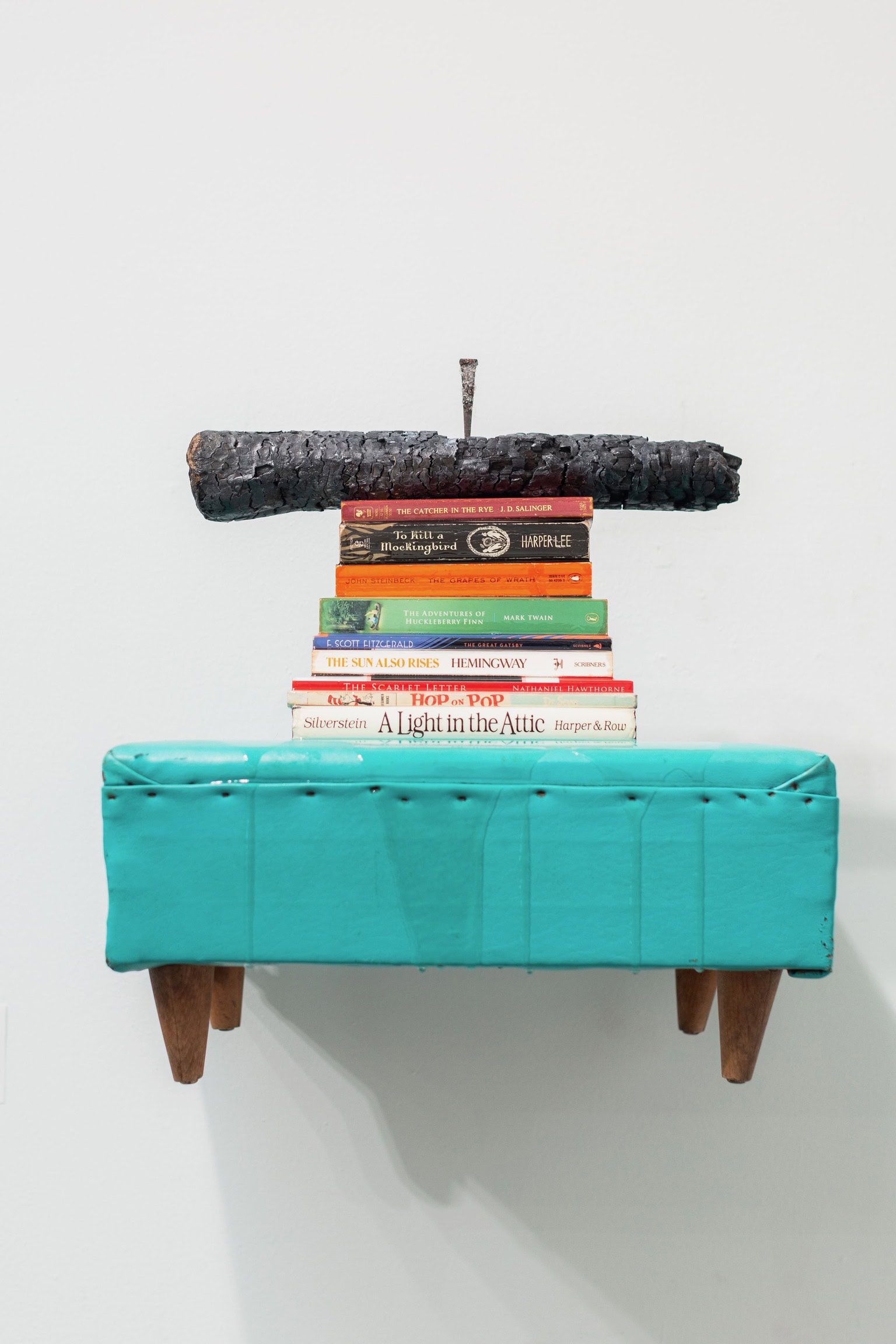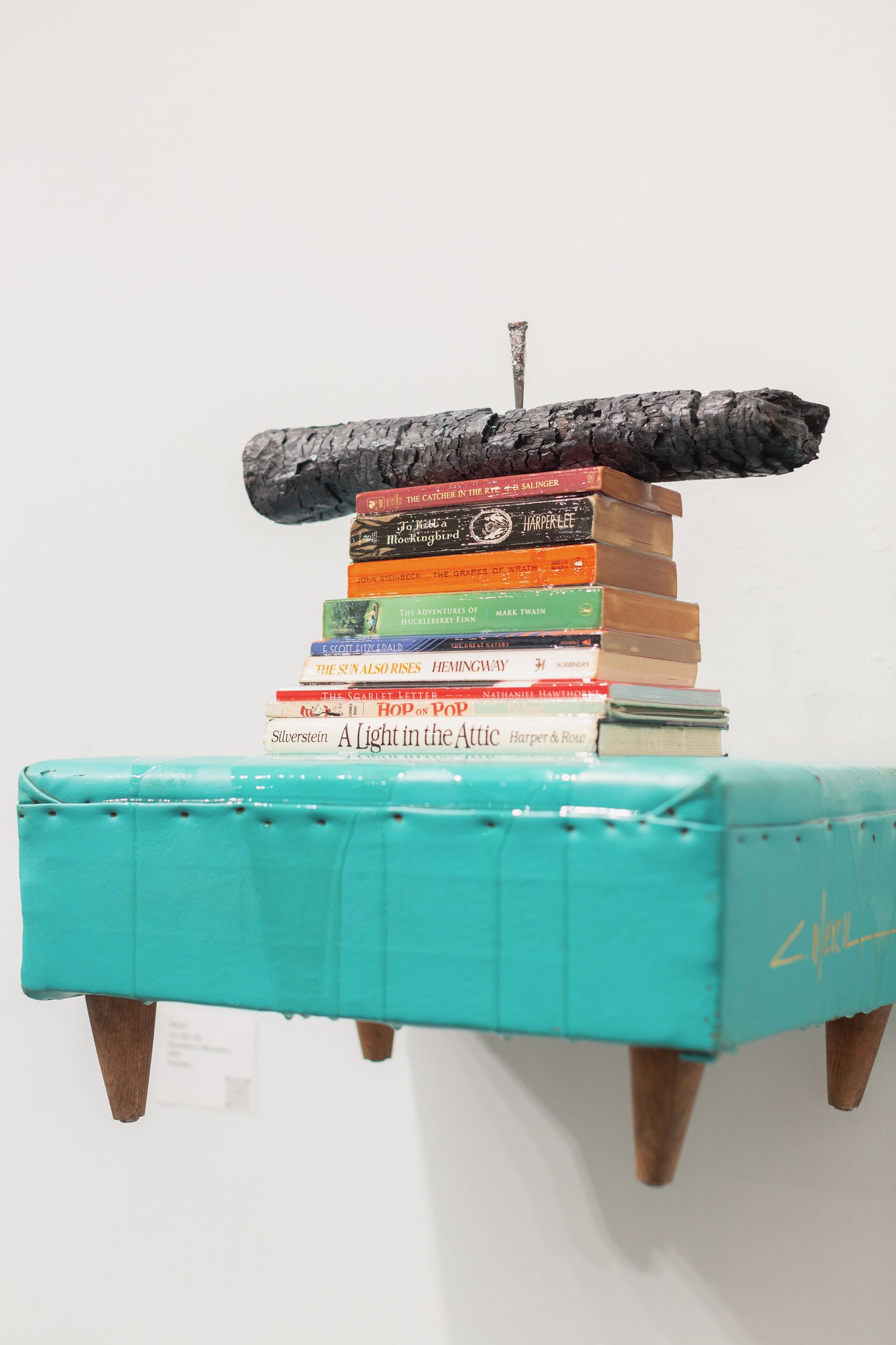Crowning this literary cairn is a piece of charred wood retrieved from an extinguished campfire, its blackened surface bearing witness to the destructive power of flame. The burned wood serves as a visceral reminder of book burning throughout history from the Nazi bonfires of the 1930s to contemporary threats against libraries and librarians. An industrial nail, dipped in crushed glass, pierces the charred wood like a crystalline sword, suggesting both the violence inherent in censorship and the brilliant, refractive power of ideas that cannot be extinguished.